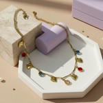 A playful yet elegant gold anklet adorned with mini heart charms and glimmering gemstones in vivid hues — symbolising love, joy, and self-expression. Heart Charm Anklet brings a radiant blend of whimsy and sophistication. Handcrafted in polished gold-tone metal, it features a delicate series of embossed mini hearts paired with vibrant red, sapphire blue, and blush peach crystals, each reflecting light with every movement.