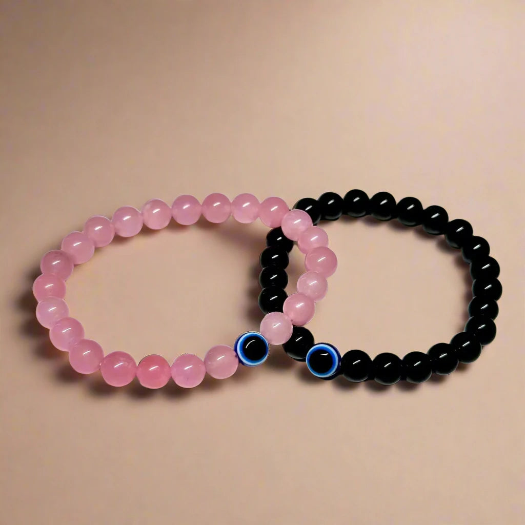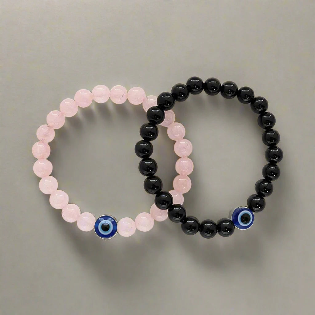 This unique combo is perfect for couples looking to deepen their connection while safeguarding their relationship. It features a rose quartz bracelet for love and an evil eye bracelet for protection.