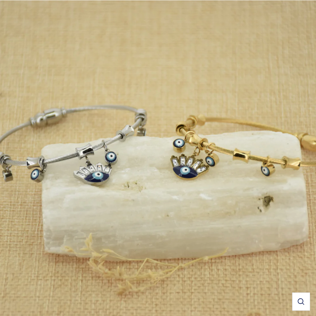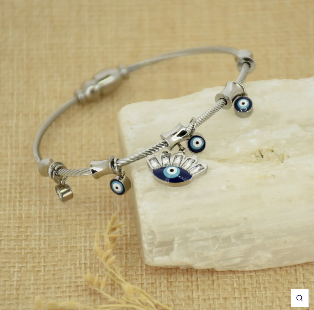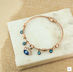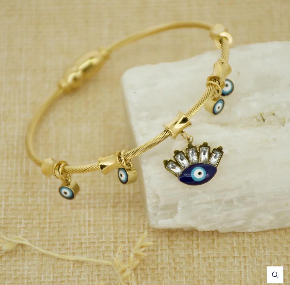 Embrace both tradition and fashion with our Evil Eye Bangle, a timeless piece that blends the mystique of ancient beliefs with contemporary elegance. The bangle features a meticulously designed evil eye charm, believed to ward off negative energy and protect its wearer from harm.