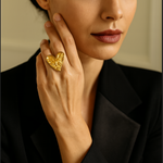 A bold expression of love and individuality, the Golden Heart Aura Ring captures attention with its unique embossed artistry and radiant golden finish. Designed in a heart shape with intricate textured details, this statement ring is a symbol of elegance and strength — perfect for those who love to stand out with style.
