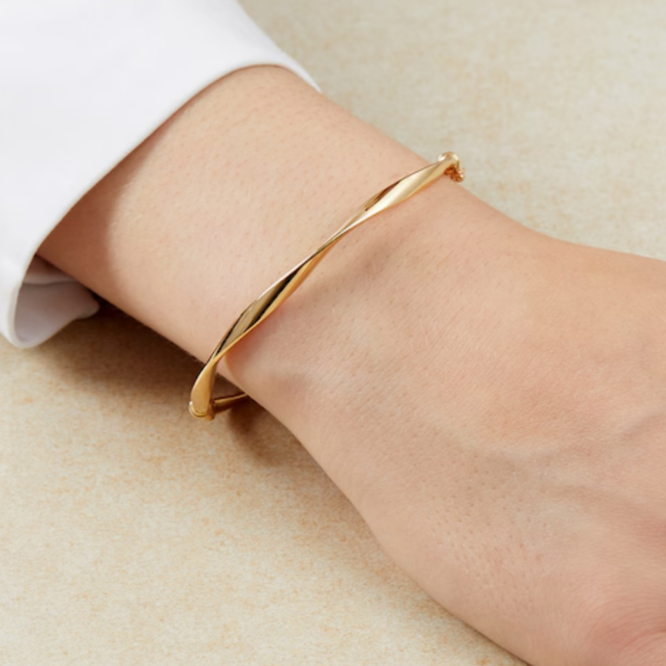 A modern twist on a timeless classic. This Twisted Bangle features a fluid, sculptural silhouette that catches the light from every angle. With its minimalist design and bold form, it’s perfect worn solo or stacked for a layered statement. Lightweight yet impactful, this piece adds an effortless touch of sophistication to any look.
