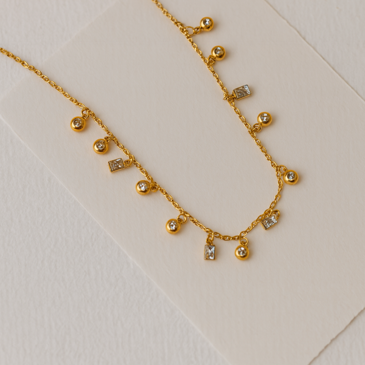 Elevate your everyday look with the Aura Spark Necklace. Crafted with a delicate gold-toned chain, this piece features sparkling round and baguette-cut crystals that dance with every movement. Its playful yet elegant design makes it perfect for layering or wearing solo, adding just the right touch of shimmer to any outfit.