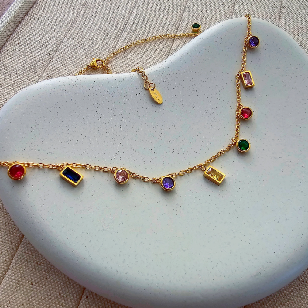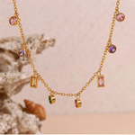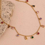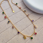 Add a playful yet sophisticated touch to your jewelry collection with our Rainbow Charm Necklace. Featuring a delicate gold-toned chain adorned with a vibrant mix of multicolored gemstones in round and rectangular cuts, this necklace is the perfect blend of elegance and charm. Each stone is set in a bezel for a sleek, modern finish, making it ideal for layering or wearing solo as a statement piece. Whether you're dressing up or adding flair to your everyday look, this necklace brings a pop of color and joy to every outfit.