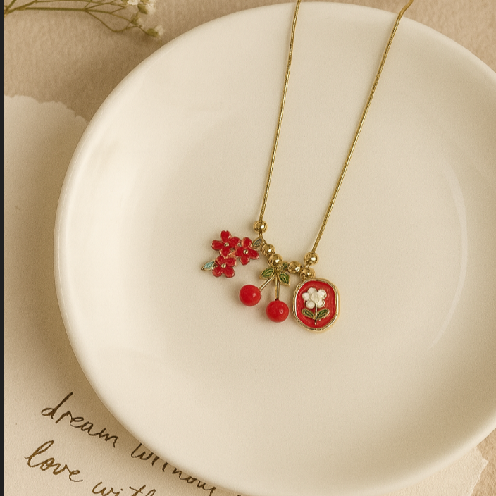 Fresh, playful, and charming — the Red Bloom Necklace is a sweet reminder of joy and beauty. Featuring glossy red cherry charms, delicate pink blossoms, and a floral enamel pendant, this necklace brings together fun and femininity in one chic accessory. Perfect for adding a pop of color to your everyday outfits or for layering with dainty chains, it’s a must-have for those who love playful elegance.
