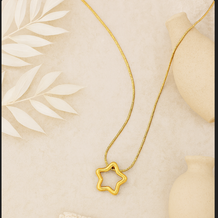 Add a touch of celestial charm with this elegant gold star necklace. Crafted with a sleek snake chain and a unique hollow star design, this piece is perfect for everyday glamour or layered looks. Made from anti-tarnish, water-resistant material, it's both durable and skin-friendly. The adjustable chain ensures a comfortable and customizable fit. A must-have minimal piece with a modern twist!