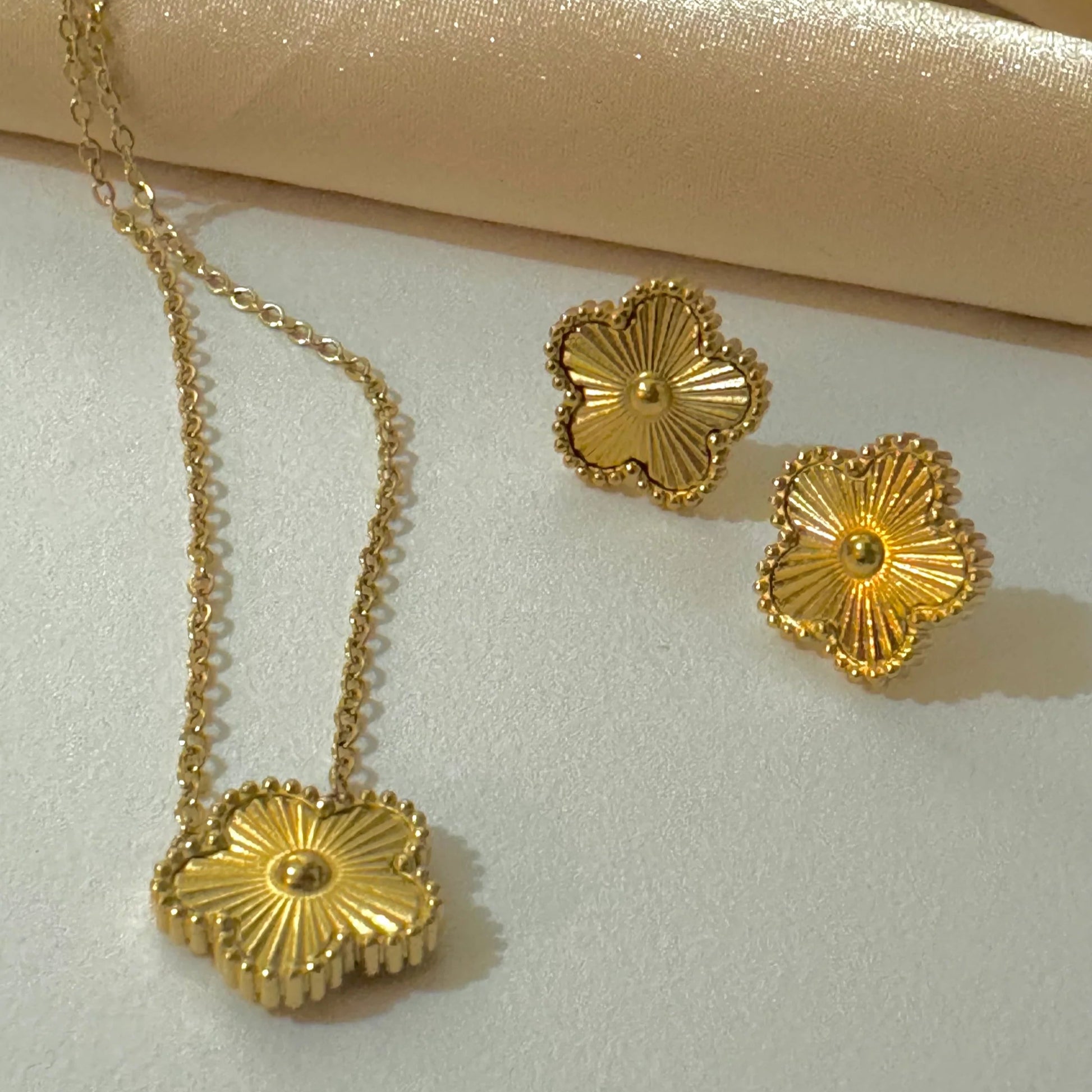 This Elegant Clover Jewelry Set features a beautifully crafted necklace and matching stud earrings, each designed in a radiant four-leaf clover motif. Made from polished gold-tone metal, the pieces are adorned with fine, textured detailing that radiates from a central dome, adding a sophisticated shimmer with every movement. The beaded edge around the petals enhances the floral shape, giving the set a luxurious and timeless charm. Perfect for both everyday elegance and special occasions, this set is a symbol of luck and refined style.